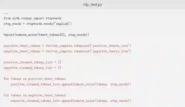 在进行下一步的建模练习之前,我们使用remove_noise()函数来清理积极和消极的推文。注释掉打印示例推文上的remove_noise()输出的行,并将以下内容添加到nlp_test.py脚本中: