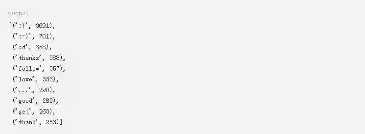 从这个数据中,您可以看到emoticon实体构成了正面推文的一些最常见的部分。在继续下一步骤之前,请确保您注释掉了脚本中打印前10个标记的最后一行。