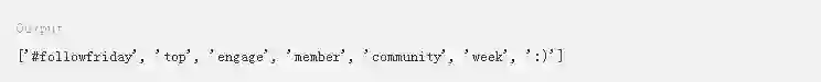 类似地,要删除@提及,该代码会使用正则表达式替换文本的相关部分。该代码会使用re库搜索@符号,后面跟着数字、字母或_,并用一个空字符串替换它们。
