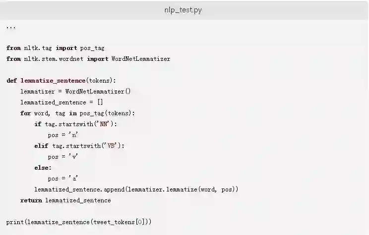 lemmatize_sentence函数首先获取一个推文的每个标记的位置标签。在if语句块中,如果标签以NN开头,则标记被指定为名词。类似地,如果标签以VB开头,则标记被指定为动词。