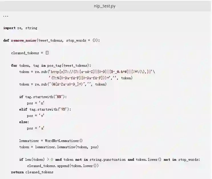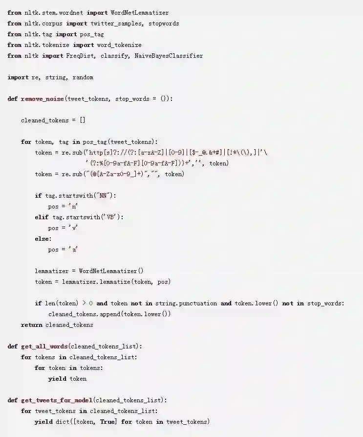 我们还将删除本教程中注释掉的代码和lemmatize_sentence函数,因为词形还原是由新的remove_noise函数来完成的。