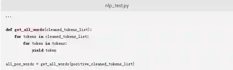 下面的代码段定义了一个名为get_all_words的生成器函数,该函数以一个推文列表作为参数,以提供一个将所有推文标记中的单词结合起来的单词列表。将以下代码添加到您的nlp_test.py文件中: