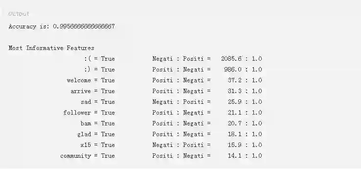在显示信息性特征的表格中,输出中的每一行都显示了训练数据集中标签为正面和负面的推文中一个标记出现的比率。数据中的第一行表明所有的推文中都包含标记:(,负面推文与正面推文之比为2085.6:1)。有趣的是,正面数据集中似乎有一个带有:(的标记。您可以看到,文本中最具辨识度的两个项目是表情符号。此外,像sad这样的词会导致负面情感,而welcome和glad则与正面情感相关。