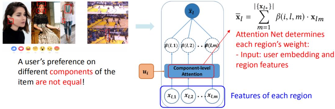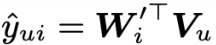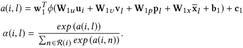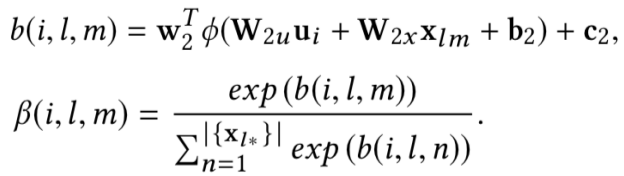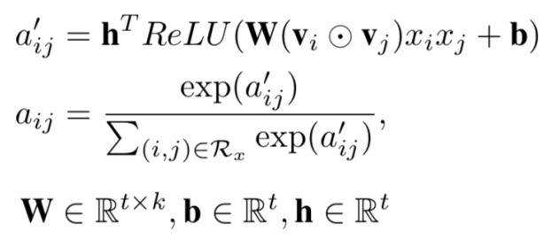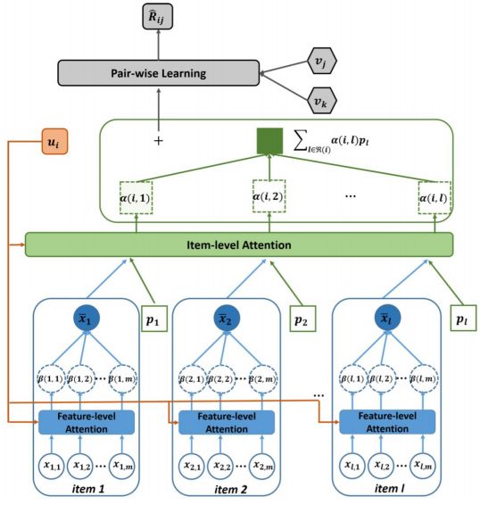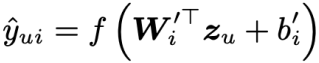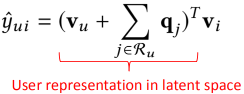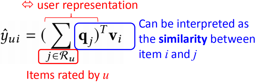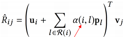 注意到用户表达不再是独立的隐向量,而是用用户喜欢过的所有 item 的累加求和得到作为 user 的表达;而 item 本身的隐向量 vi 是另一套表示,两者最终同样用向量内积表示。