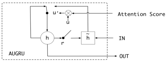 其中,ut' 引入了 at 来取代原有的更新向量 ut,表达的是当前 ut' 对结果的影响。如果当前权重 at 较大,ut' 也较大,当前时刻 ht' 保留更多,上一个时刻 ht-1 影响也会少一点。从而整个 AUGRU 结果可以更平滑的学习用户兴趣。