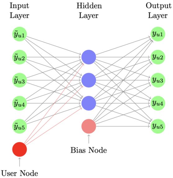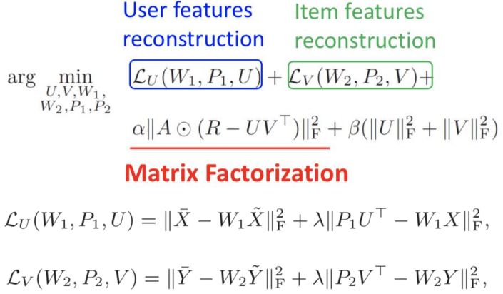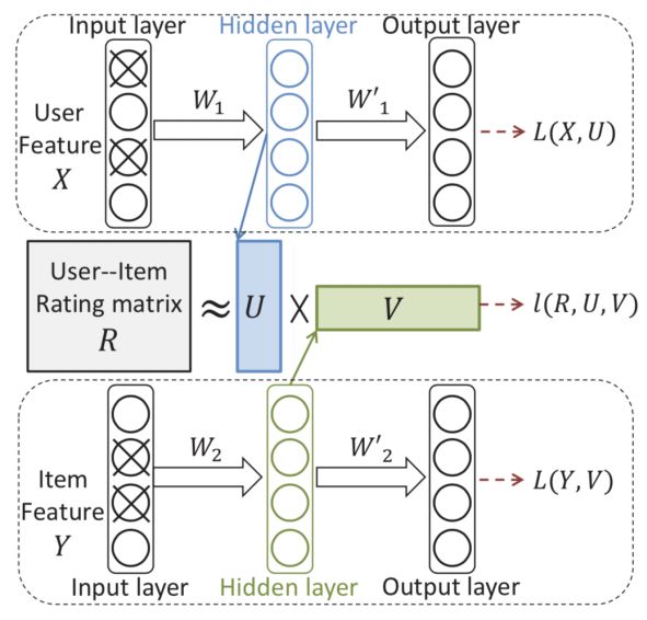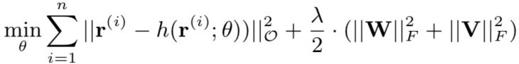 用 ru 表示用户向量,ri 表示 item 向量,通过 autoencoder 将 ru 或者 ri 投射到低维向量空间 ( encode 过程 ),然后再将其投射到正常空间 ( decode 过程 ),利用 autoencoder 中目标值和输入值相近的特性,从而重建 ( reconstruct ) 出用户对于未交互过的 item 的打分。