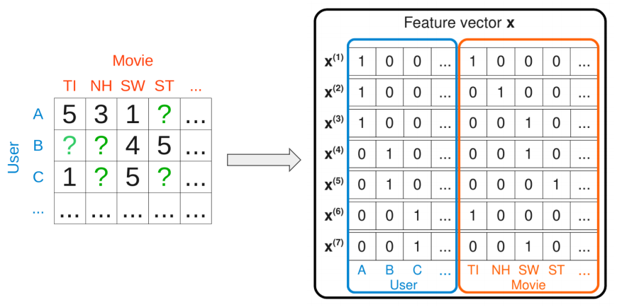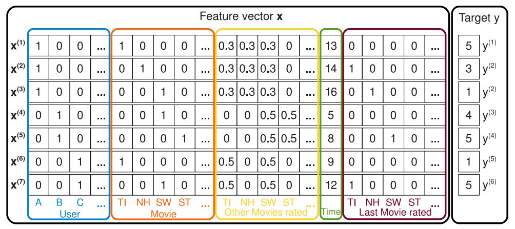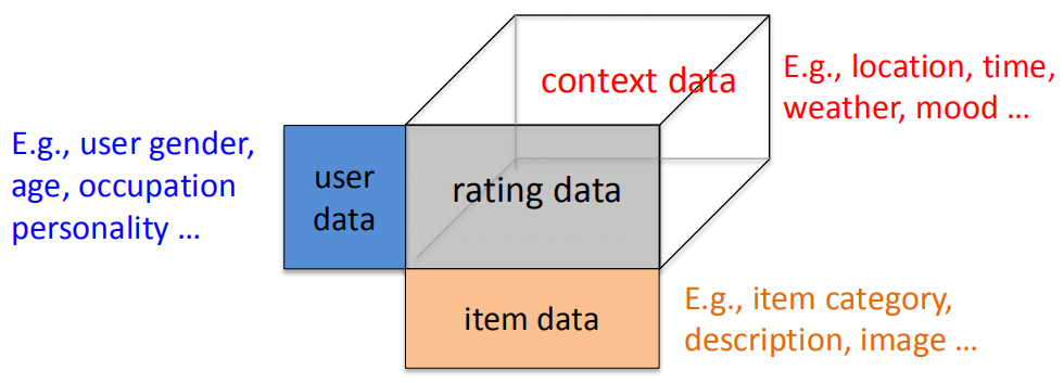 上述的方法中,无论是 CF,MF,SVD,SVD++,还是 FISM,都只是利用了 user 和 item 的交互信息 ( ratin g data ),而对于大量的 side information 信息没有利用到。例如 user 本身的信息,如年龄,性别、职业;item 本身的 side information,如分类,描述,图文信息;以及 context 上下文信息,如位置,时间,天气等。因此,传统模型要讲的第二部分,是如何利用这些特征,去构造 feature-based 的 model。