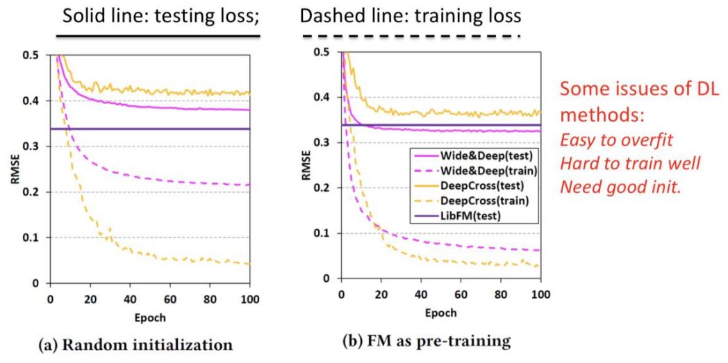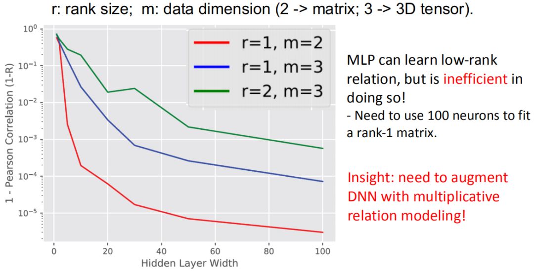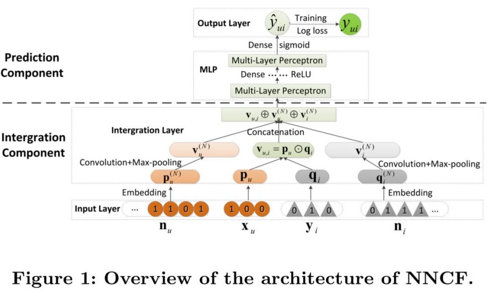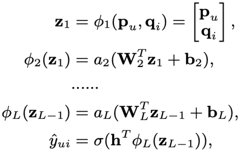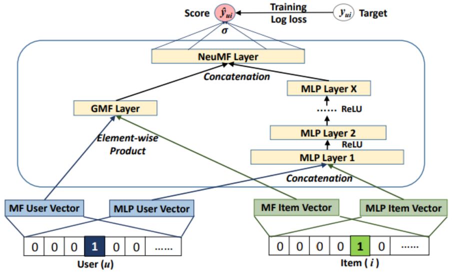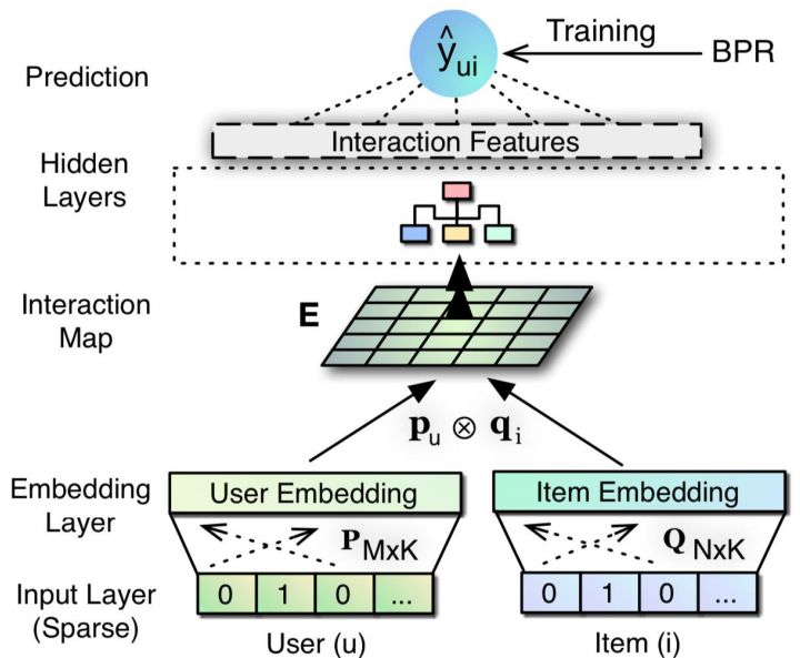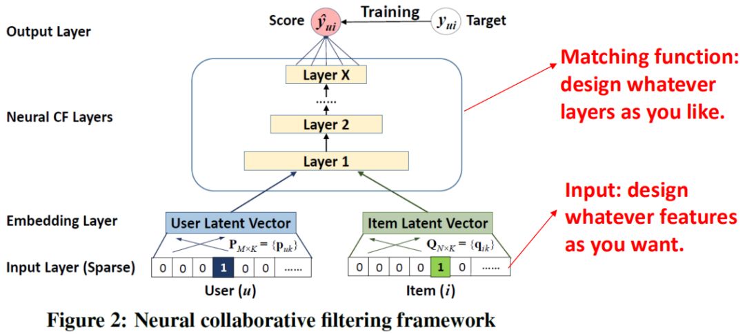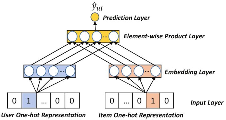 对比普通的 CF 模型,最大的特点是在 representation function 中,增加了非线性的 MLP,但是由于输入是 one-hot 的,假设用户规模是100万,MLP 的第一层隐层是100,整个网络光 user 侧的第一层参数将达到1亿,参数空间将变得非常大。