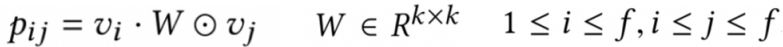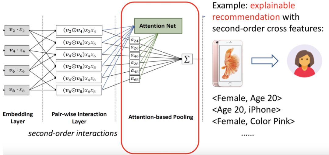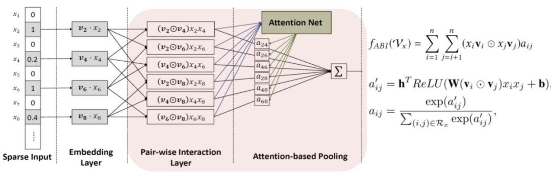 交叉使用的带权重的 bi-interaction,可以理解成所有 vector 的 weight sum pooling,然后使用一个简单的线性模型得到最终的值。