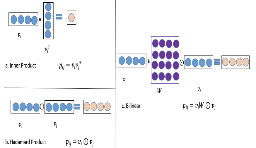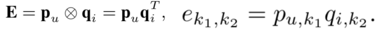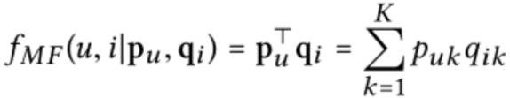 ❷ 用户 u 和物品 i 的向量点积 ( inner product ) 得到的 value,可以用来代表用户 u 对物品i的喜好程度,分数越高代表该 item 推荐给用户的概率就越大。