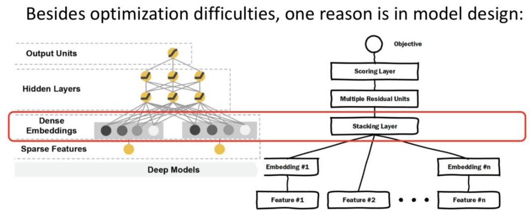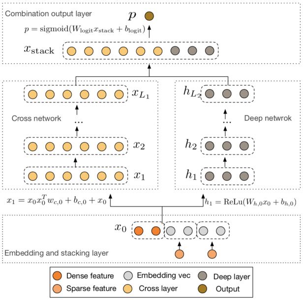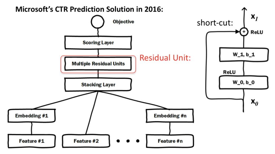 和 wide&deep 最大的不同是 deep 部分引用了 res-net,但个人觉得在目前主流的模型里用的较少。虽然 res-net 理论上可以使用更深的模型提升效果,但在目前工业界大规模稀疏的推荐系统里,还没见到太多往 res-net 方向取得较大进展的工作。