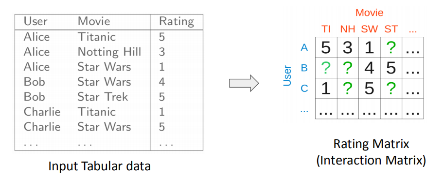CF 协同过滤的思路要解决的问题用数据形式表达就是:矩阵的未知部分如何填充问题 ( Matrix Completion )。如图2.1所示,已知的值是用户已经交互过的 item,如何基于这些已知值填充矩阵剩下的未知值,也就是去预测用户没有交互过的 item 是矩阵填充要解决的问题。