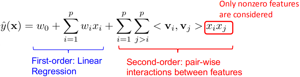 注意红色部分表示的是二阶特征的两两组合 ( 特征自己和自己不做交叉 ),向量之间的交叉还是用向量内积表示。FM 模型是 feature-based 模型的一个范式表达,接下来介绍的几个模型都可以看成是 FM 模型的特殊范例。