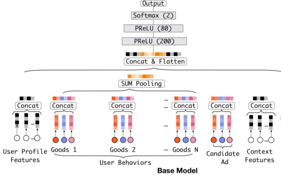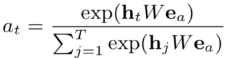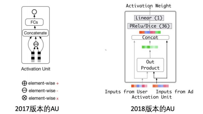 对于每个历史行为 ht,当前候选广告 ea,通过 softmax 求出两者的权重。注意这里不是直接向量点击,而是引入了矩阵 W,可以认为是简单的一层全连接网络。