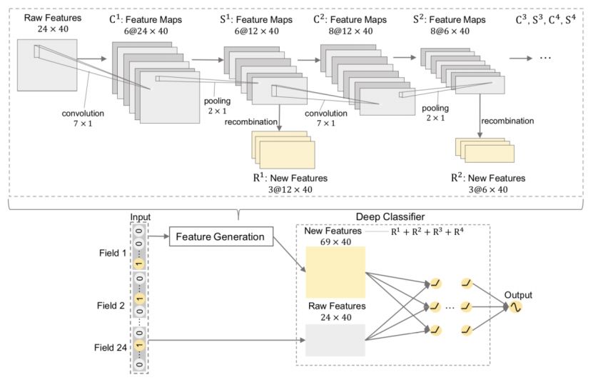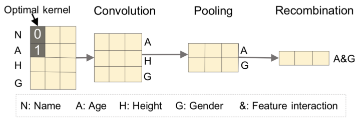 通过使用 CNN 模块,先是卷积层提取局部特征的连接,如高度等于3能够提取相邻3个 field 的特征的关系,因此具有高阶特征的交叉能力。然后又通过池化层提取 global 信息,确保特征的输入顺序对结果的影响能够被捕捉到。
