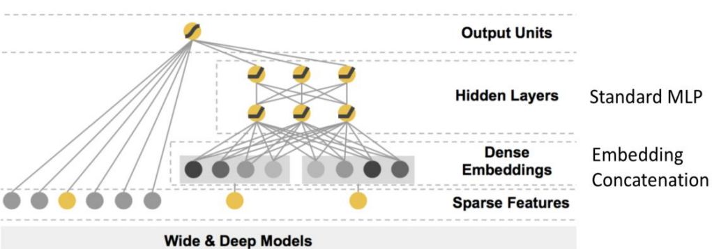 深度加宽度的模型范式,本身并不是一个具体的模型,wide 和 deep 部分可以用任意结构框架,wide 的 baseline 是 LR 模型;deep 的 baseline 是 MLP 模型。