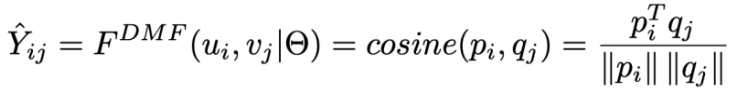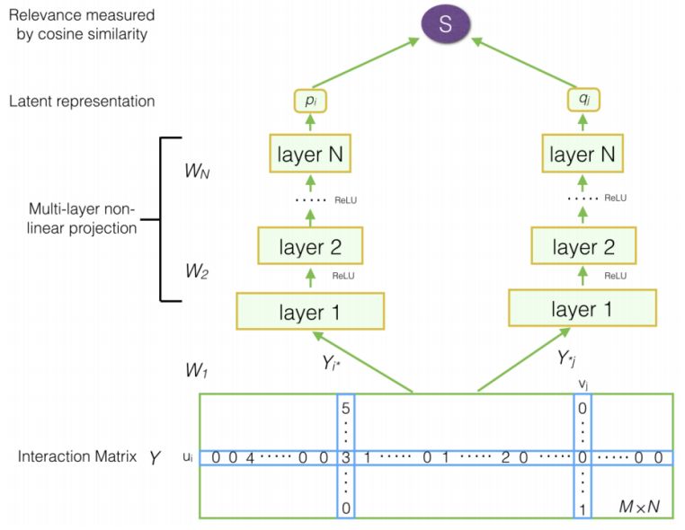 DMF 模型也就是深度矩阵分解模型,在传统的 MF 中增加了 MLP 网络,整个网络框架如图3.3所示。