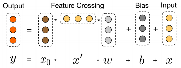 使用多层的 cross 来做特征交叉,对于 cross 网络中每一层的输入都由前一层以及第一层的输入组成,从这个维度上代表的是高阶特征的组合。比如说,第四层网络的输出包含了第三层和第二层的输入;而第三层又包含了第二层和第一层,因此这里就是个3阶的特征交叉。特征的交叉使用的是 bit-wise,也就是每个特征内部 embedding 的 element 也会两两交叉。