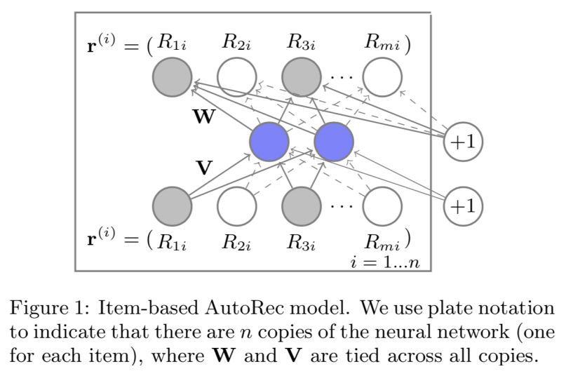 借鉴 auto-encoder 的思路,AutoRec 模型对输入做重建,来建立 user 和 item 的 representation,和 CF 一样,也可以分为 user-based 和 item-based 的模型。对于 item-based AutoRec,input 为 R 里的每列,即每个 item 用各个 user 对它的打分作为其向量描述;对于 user-based AutoRec 则是用 R 里的每行来表示,即每个 user 用他打分过的 item 的向量来表达。
