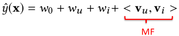 假如只使用 userid 和 itemid,我们可以发现其实 FM 退化成加了 bias 的 MF 模型,如图2.6所示:
