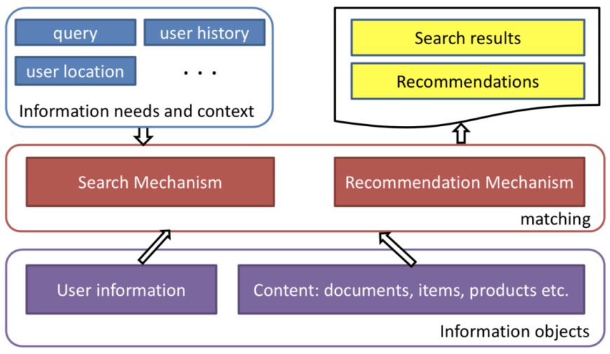 搜索和推荐的目标都是针对一次 context ( 或者有明确意图,或者没有 ),从候选池选出尽可能满足需求的物品。两者区别只是挑选过程使用的信息特征不同。