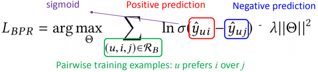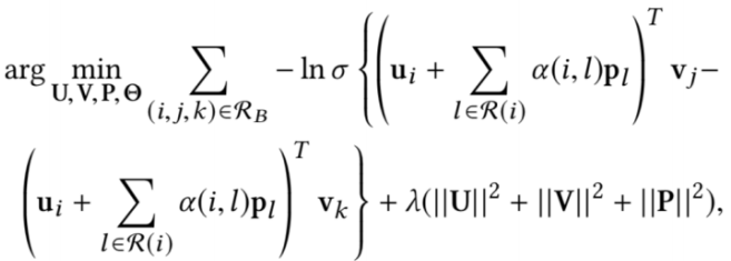 如上述公式所示,不直接拟合用户对 item 的单个打分,而是以 pair 的形式进行拟合;一般来说,用户打分高的 item > 用户打分低的 item;用户用过交互的 item > 用户未交互过的 item ( 不一定真的不喜欢 )。