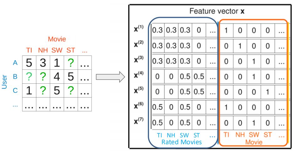 如果输入包含两个变量,① 用户交互过的 item 集合;② itemid 本身,那么,此时的 FM 又将退化成带 bias 的 FISM 模型,如图2.7所示,蓝色方框表示的是用户历史交互过的 item ( rated movies ),右边橙色方框表示的是 itemid 本身的 one-hot 特征。