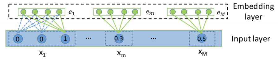 可以发现这里的输入都是 one-hot 的,一般来说 M 用户数比较大,N 作为 item 数量假设是百万级别的。