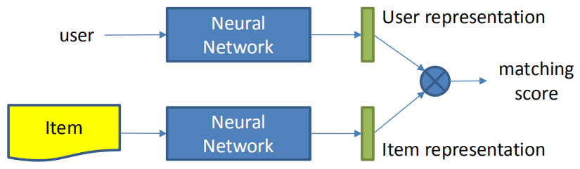 本章主要讲述第一种方法,representation learning,也就是基于表示学习的方法。这种方法会分别学习用户的 representation 以及 item 的 representation,也就是 user 和 item 各自的 embedding 向量 ( 或者也叫做隐向量 ),然后通过定义 matching score 的函数,一般是简单的向量点击、或者 cosine 距离来得到两者的匹配分数。整个 representation learning 的框架如图3.1所示,是个典型的 user 和 item 的双塔结构: