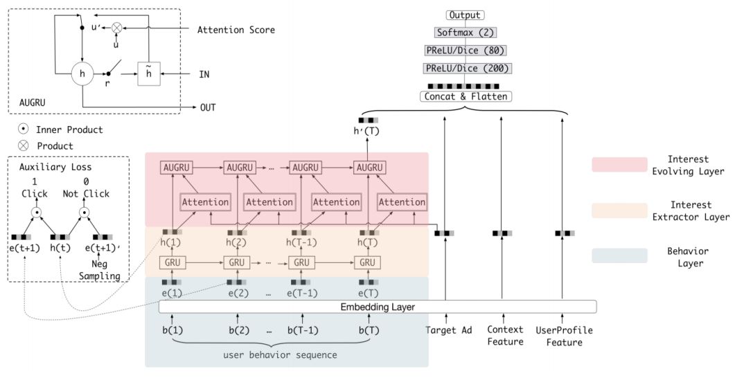 该层的主要作用和 DIN 一样,为了从 embedding 层中抽取出用户的兴趣。该 paper 认为用户当前对候选广告是否感兴趣,是和历史行为 behavior 有关的,所以引入了 GRU 的序列模型来拟合抽取用户兴趣。