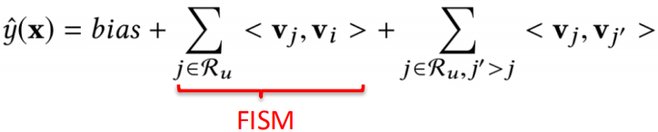 上述提到的两种模型 CF 方法和 MF 方法都只是简单利用了 user-item 的交互信息,对于用户本身的表达是 userid 也就是用户本身。2014年 KDD 上提出了一种更加能够表达用户信息的方法,Factored Item Similarity Model,简称 FISM,顾名思义,就是将用户喜欢过的 item 作为用户的表达来刻画用户,用数据公式表示如下: