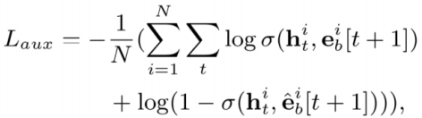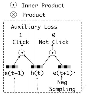 其中 a 为超参数,代表的是辅助 loss 对整体 loss 的贡献。有了这个辅助 loss,t 时刻提取的隐层向量 h(t) 可以比原始的 h(t) 更有助于表达用户兴趣,也可以加速网络的训练过程。