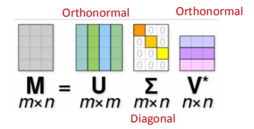 其中左侧 M=m*n 表示用户评分矩阵,m 矩阵的行表示用户数,n 矩阵的列表示 item 数,在大多数推荐系统中 m 和 n 规模都比较大,因此希望通过将 M 分解成右侧低秩的形式。一般来说 SVD 求解可以分为三步: