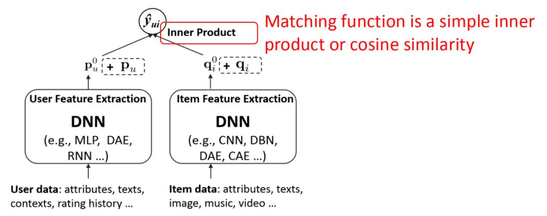 基于 representation learning 的深度学习方法,又可以分为两大类,基于 CF 以及 CF + side info 的方法。下面的介绍将分别从 input 、representation function 和 matching function 三个角度分别看不同的模型有什么不同。