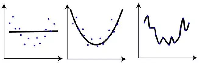 下图我们画出了在同一个数据集上解决回归问题的三种不同模型,从下图中我们可以总结出什么?