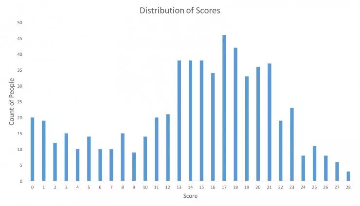 你可以点击 http://t.cn/R0hNQgs 来获取所有得分。我们有超过 600 人参与到了技能测试中,最高分是 28 分,这里还有一些其他统计量。