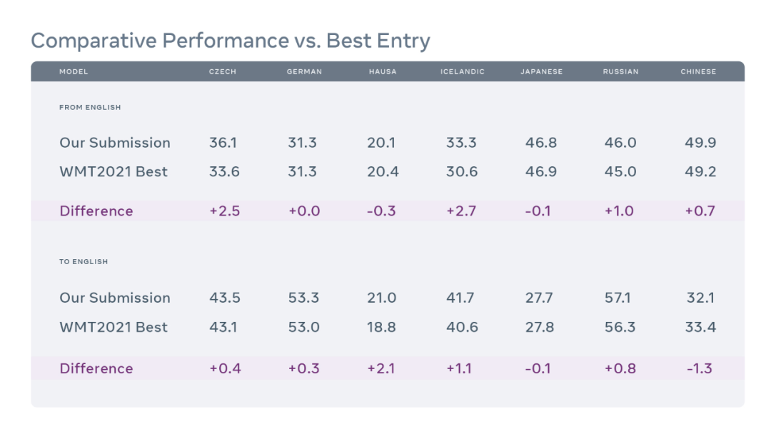 Meta 相信,他们在 WMT 2021 上取得的成绩巩固了多语言翻译作为构建单一通用翻译系统的重要途径。他们还证明了,对于高资源和低资源语言,单个多语言模型可以提供较双语模型更高的翻译质量,并且更易于针对「新闻文章翻译」等特定任务进行微调。