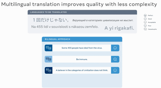 Meta 的多语言模型是 MT 中一个激动人心的转折点,因为它表明——通过大规模数据挖掘、扩展模型容量和更高效的基础设施方面的新进展——多语言模型有可能在高资源和低资源任务上实现更好的性能。这一技术使研究者更接近于构建一个通用翻译器。