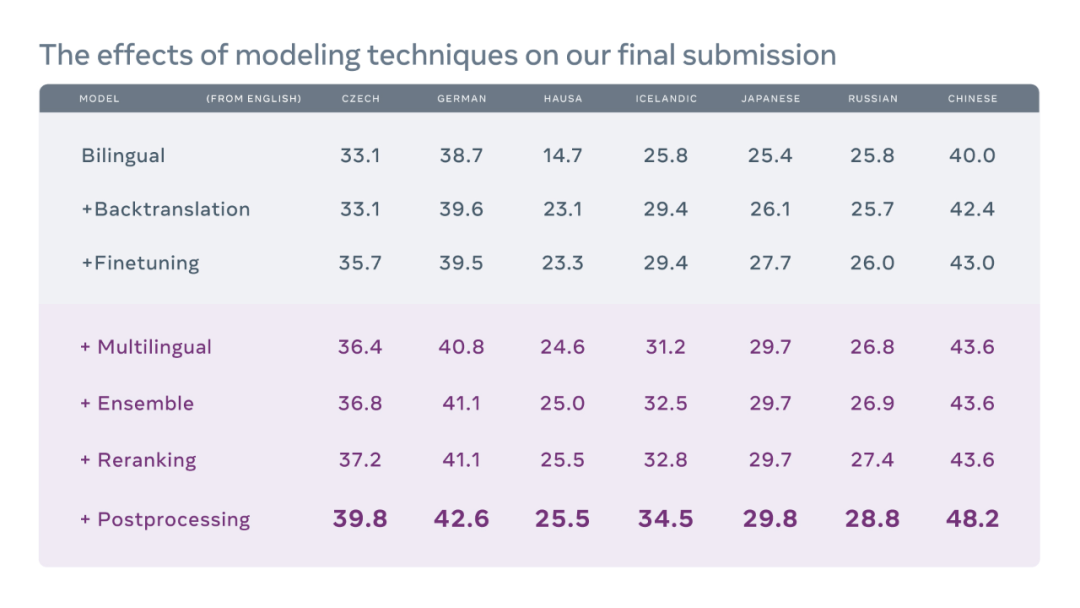 Meta 提出的单个多语言模型,首次超过最佳双语模型,赢得了著名的 WMT 竞赛。