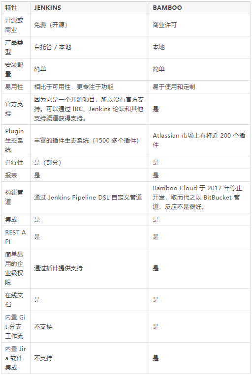 以下是 Bamboo 和 Jenkins 的对比快照: