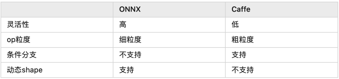 上面的表列了ONNX和Caffe的几点区别,其中最重要的区别就是op的粒度。举个例子,如果对Bert的Attention层做转换,ONNX会把它变成MatMul,Scale,SoftMax的组合,而Caffe可能会直接生成一个叫做Multi-Head Attention的层,同时告诉CUDA工程师:“你去给我写一个大kernel“(很怀疑发展到最后会不会把ResNet50都变成一个层。。。)
