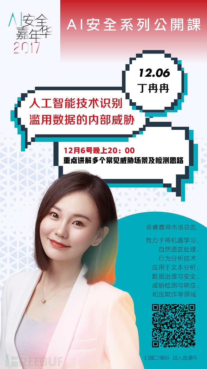 本次,丁冉冉将带来主题为《人工智能技术识别滥用数据的内部威胁》的分享,本次公开课内容重点讲解下述多个常见威胁场景及其检测思路:
