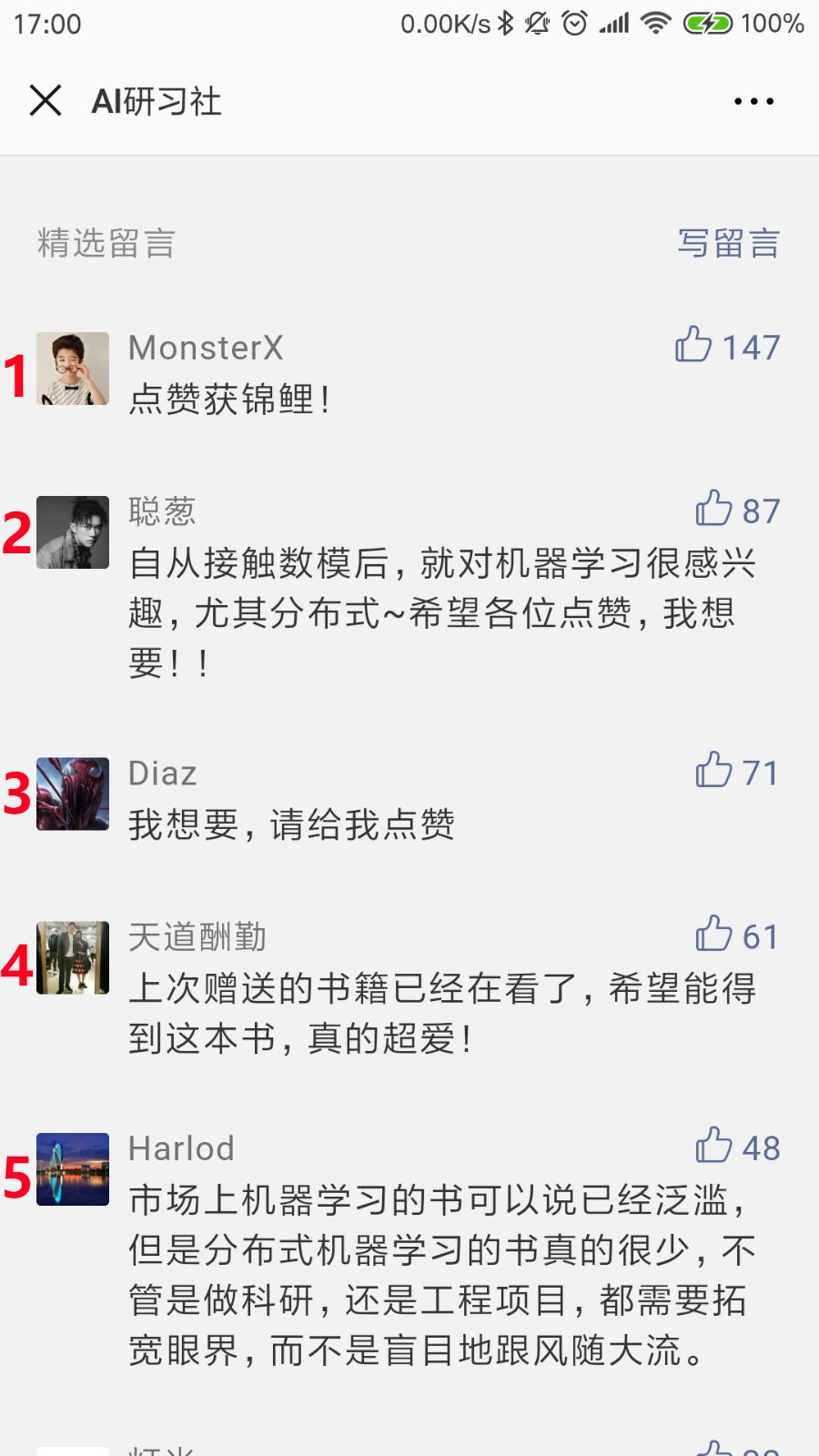 上周末的 赠书活动 也已经结束啦,一起来看看哪五位朋友会获得由AI研习社联合机械工业出版社华章科技送出的新书《分布式机器学习:算法、理论与实践》呢?