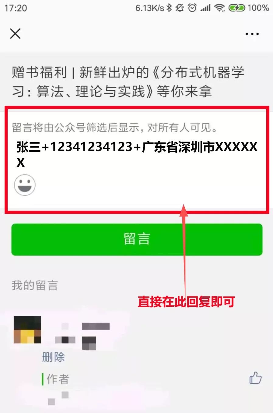 请以上五名朋友收到通知后尽快在微信的服务通知中打开原来的留言页面,并【回复姓名+电话+收货地址】,工作人员将进行联系,请注意物流信息。填写收货信息步骤如图所示: