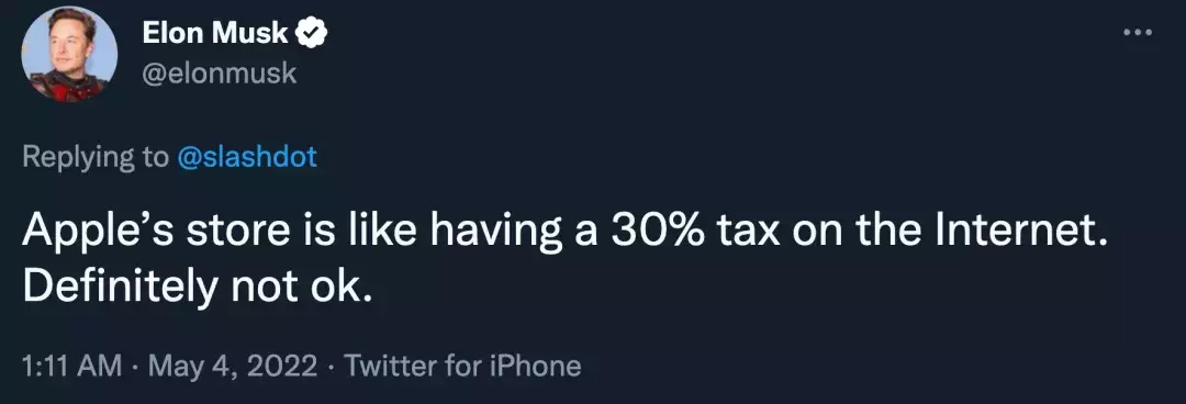 今年 5 月,马斯克表示:“苹果商店就像在互联网上征收 30% 的税。这绝对不行”。还表示 “30% 的费用实际上比应有的高出 10 倍”。