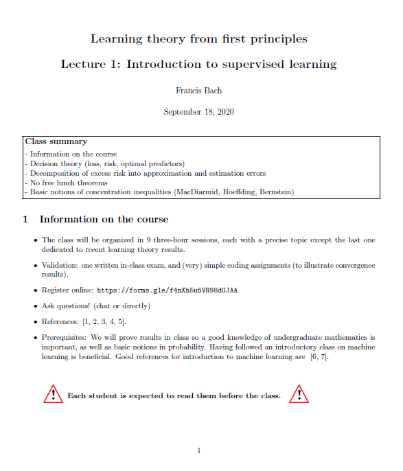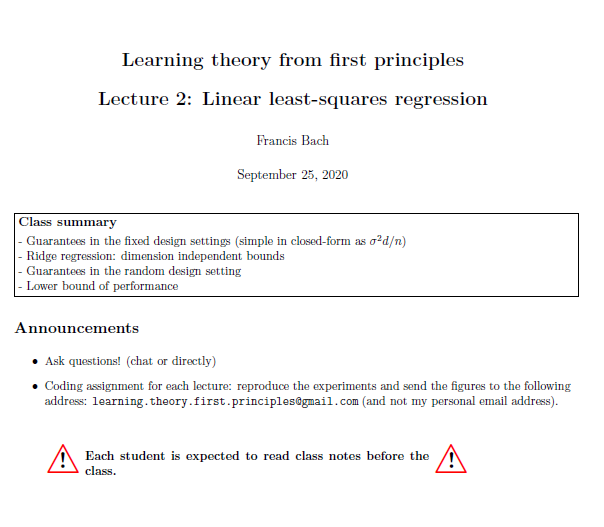 本课程分为9节,每节3小时,除了最后一节专门介绍最近的学习理论成果外,每节都有一个精确的主题。见下面的暂定时间表。