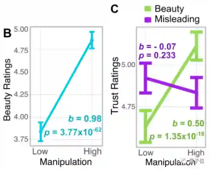 这意味着,志愿者们普遍认为更漂亮的图片看起来更可信,即使它被进行了误导性操作。