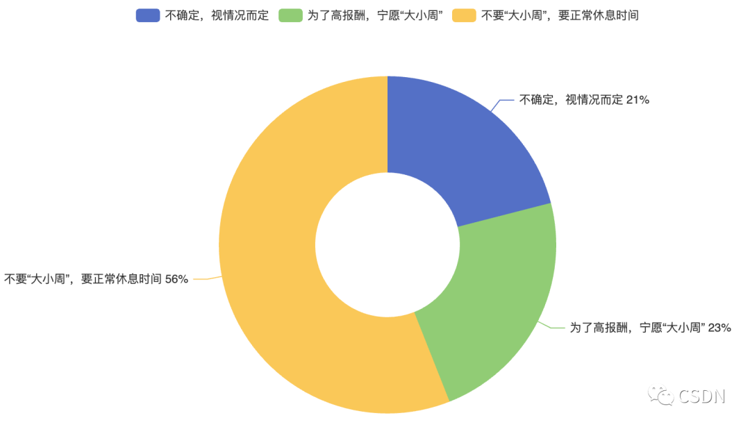 对于大部分程序员来说,舒适的工时总是很难匹配到理想的高薪,因此对于“大小周”的态度,他们也分成了两个阵营:23% 的开发者表示,虽然大小周会占用周末休息时间,但为了高薪宁愿“大小周”;56% 的开发者则选择更轻松的生活方式,不要“大小周”。