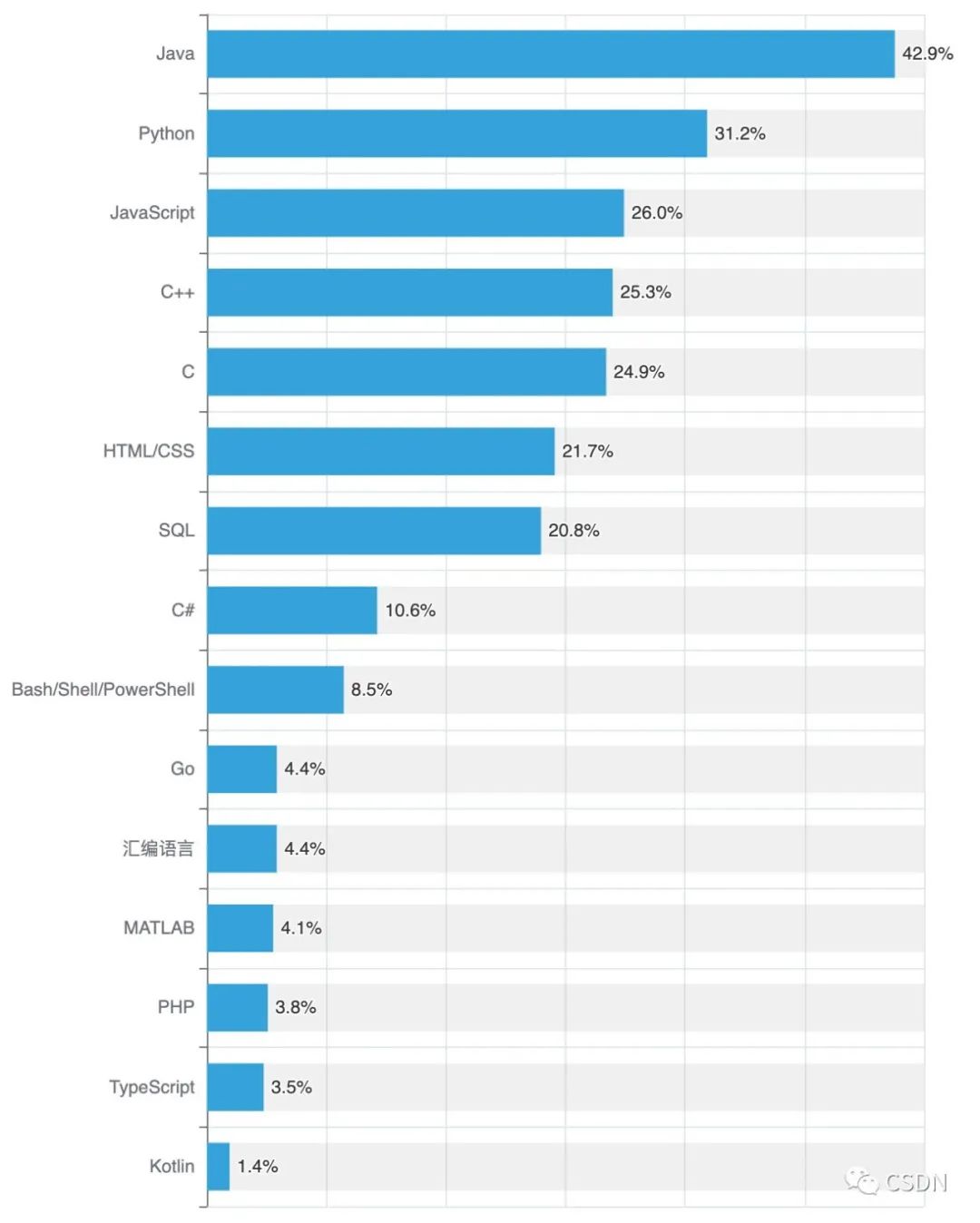 对程序员而言息息相关的编程语言方面,国内使用 Java 的开发者人数依旧稳居第一,近来长期占据 TIOBE 榜单第一的 Python,则以 31.2% 的占比高居第二。另外,Python 也是 25.3% 的开发者想要学习的下一门编程语言——可见随着人工智能的发展,Python 的使用量正在逐渐提升,其在开发者圈子也非常受欢迎。