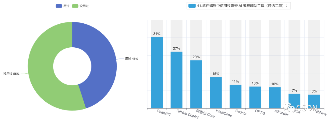 ▶ 在过去一年中,有 45% 的开发者表示曾使用过 AI 编程相关工具,其中使用过 ChatGPT 的开发者更是直接占到了 34%。
